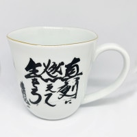 有田焼マグカップは 藤岡弘、の直筆の書「真剣に燃えて生きろ」入り。